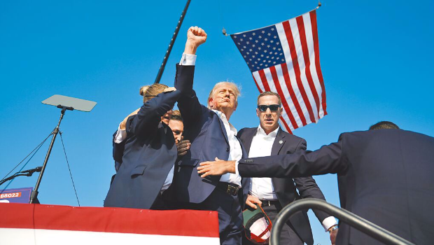 ▲特朗普2024年7月13日在賓州巴特勒郡(Butler County)出席競選活動時遇刺,現場傳出多聲槍聲,多名特勤人員沖上臺掩護特朗普,特朗普右耳受傷、臉部染血,仍一路振臂揮拳喊口號。(美聯社)