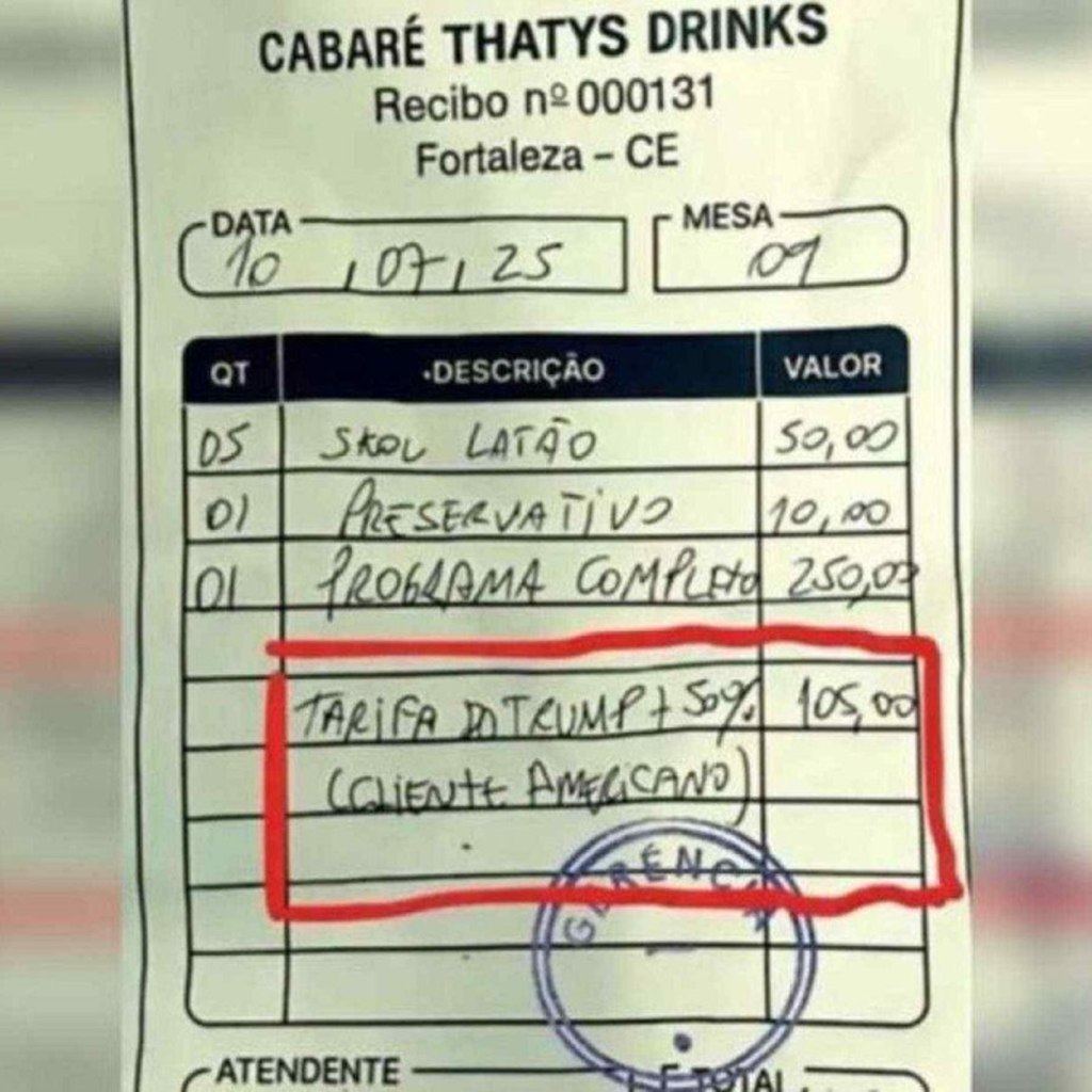 根據英國《太陽報》(The Sun)報導,位于巴西東北部城市福塔雷薩(Fortaleza)的Cabaré Thatys Drinks妓院已經開始向美國客人加收50%的稅率,而費用名稱就寫著“特朗普關稅(Tarifa do Trump)+50%”,讓美國顧客一晚的“全套服務”費用飆漲。