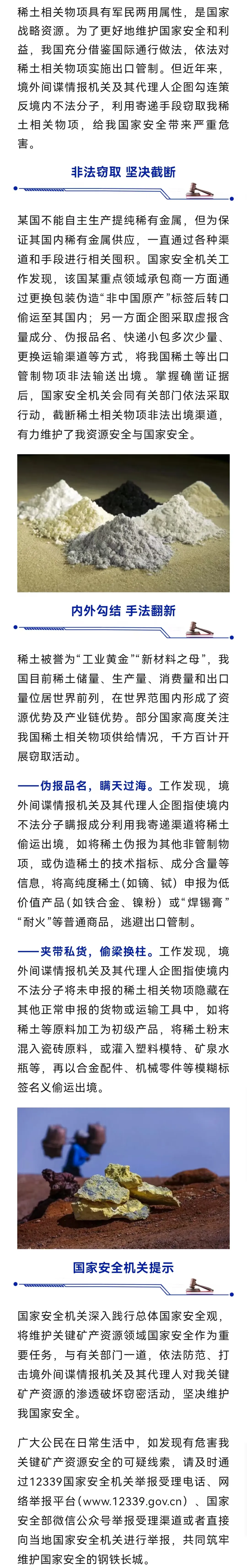 首頁>內地>要聞 國安部披露:境外間諜企圖勾連不法分子,將稀土粉末灌入塑料模特等偷運出境 發布時間:2025-07-18 08:38 國家安全部18日發文《劃重點!它可不是一般的土》,全文如下: 來源︱國家安全部 編輯︱梁景琴 熱門文章 多間大行上調中國今年GDP增長預測,“最?!绷?.1% 關稅戰︱美國據報延長關稅暫緩限期三個月 海底電纜︱美國擬推新規定,禁用中國技術或設備 德魯茲人是誰?為什么以色列不惜轟炸敘利亞也要保護他們? 基隆“立委”罷免案門檻正式出爐,同意票必須沖破75995票 越南太快與美達成協議反而不利?專家揭最大擔憂 胡錫進:宗慶后“布鞋首富”人設崩塌,勿搞“造神”運動 南方電網接手一年,秘魯用戶數最大配電商轄區停電時間降至全國最低 關稅戰|美商務部:將對中國進口石墨加征93.5%關稅 馬云現身西湖夜騎,同款自行車賣1.85萬元 專題 更多 > 中芯國際上半年營收預計超22億美元,四季度將試產7nm工藝 太興盈喜料多賺逾3倍,指將堅守審慎理財政策 中國移動半年多賺5%,中期息增近6% 清華女學霸創業、一年一融資,鎂佳股份估值9.3億美元沖刺港交所 應收賬款走高,豐沃股份三成收入打“白條” 惠科股份IPO:獲政府補助超53億,向實控人堂弟采購超8億 關稅戰|白宮:特朗普簽行政命令,對華關稅暫緩期再延長90日 高盛:64%關稅成本由美企“買單”,消費者僅承擔22% 美媒:特朗普政府通過關稅施壓,要求買美國軍火