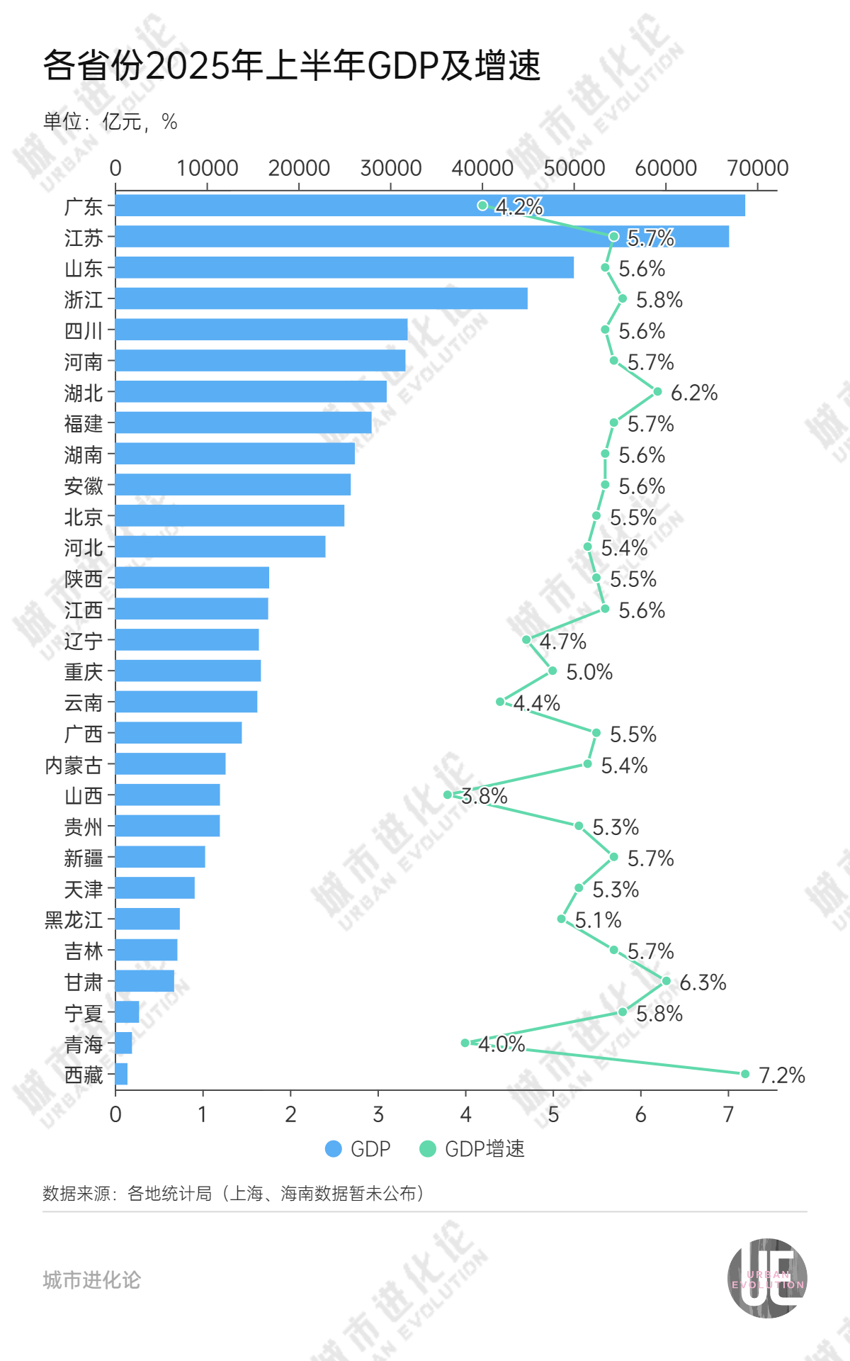 經濟總量排名靠前省份中,第一大省廣東上半年GDP增速僅為4.2%,同樣排名全國倒數。而經濟規模第七的湖北表現亮眼,其GDP增速達到6.2%,僅次于西藏和甘肅,位列全國第三。