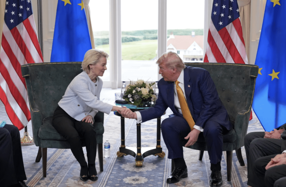 美國總統特朗普于27日在蘇格蘭西部海濱高爾夫度假村特朗普滕伯里(Trump Turnberry)會見歐盟執委會主席馮德萊恩后宣布,雙邊已達成貿易協議,將歐盟向美國輸出產品的關稅降至15%,等于是把特朗普先前揚言的30%關稅砍半;歐盟同意向美國購買價值7500億美元的能源,及額外投資6000億美元。美媒報道指,這是特朗普試圖通過對美國貿易伙伴征收更高關稅重塑全球貿易體系以來達成的最大協議。