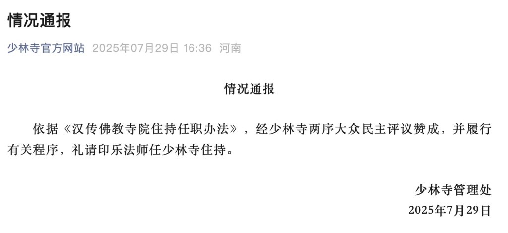 據悉,今年5月,當地政府已派人以“少林寺管理處”的名義常駐少林。少林寺管理處宣布,依據《漢傳佛教寺院住持任職辦法》,經少林寺兩序大眾民主評議贊成,并履行有關程序,禮請印樂法師任少林寺住持。