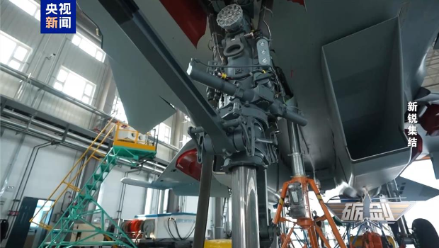 ▲殲-15T粗壯的的前起落架。(央視新聞)