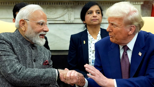 ▲短短幾個月內,美國與印度的關系由熱轉冷,美國總統特朗普甚至揚言對印度采購俄羅斯石油祭出懲罰,不在乎印度經濟崩潰。畫面為2025年2月13日,特朗普在白宮接待印度總理莫迪。(美聯社)