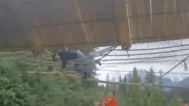 ▲新疆伊犁哈薩克自治州昭蘇縣夏塔景區一吊橋,其中一條橋索斷裂,發生橋面傾斜事故,造成5死24傷。新華社影片截圖