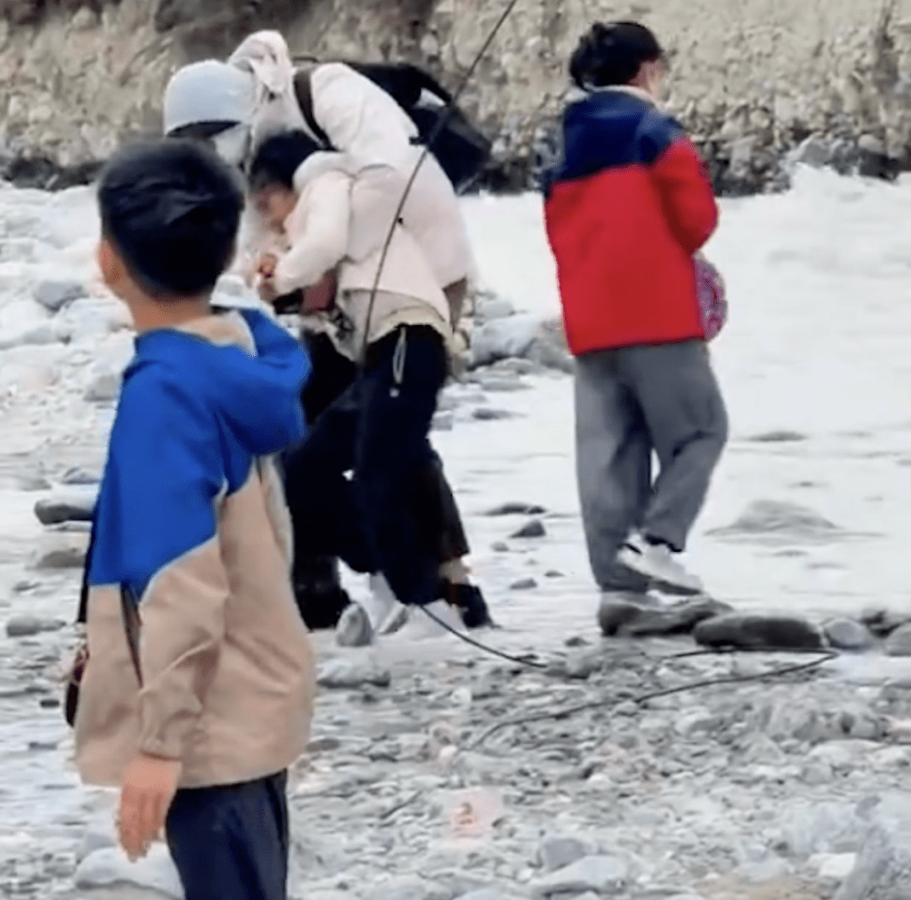 ▲從網上圖片可見,橋傾側后,有游客掉落橋下河流。微博圖片