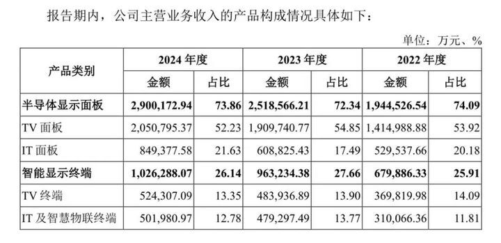 2022年-2024年,惠科股份的主營業務收入分別為262.44億元、348.18億元及392.65億元。半導體顯示面板為惠科股份最主要的收入來源,業務收入占比各期主營業務收入的74.09%、72.34%及73.86%,剩余收入則來自智能顯示終端。