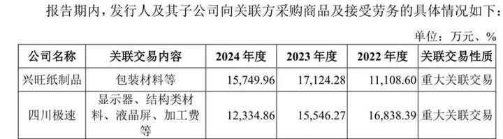 惠科股份的供應商中,存在實控人王智勇的親屬。2022年-2024年,惠科股份向興旺紙制品的采購金額分別為1.11億元、1.71億元及1.57億元,向四川極速的采購金額分別為1.68億元、1.55億元及1.23億元。