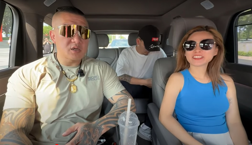 ▲館長(左)游深圳,與美女地陪聊起兩岸車價。(取自直播《漢我游深圳》)