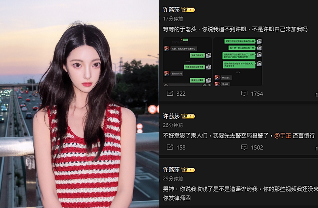于正今在社群平臺開戰許荔莎,稍早再度發文說:“關于女演員許荔莎對我司趙晴的造謠和污蔑,我們已經取證,并且準備報警和提告誹謗,因為演員正在拍戲,要等收工之后去警局報案,同時我也聯系了律師,后續會有警局回執和聲明給到大家,我覺得微博不是公審的地方,把一切交給法律”。