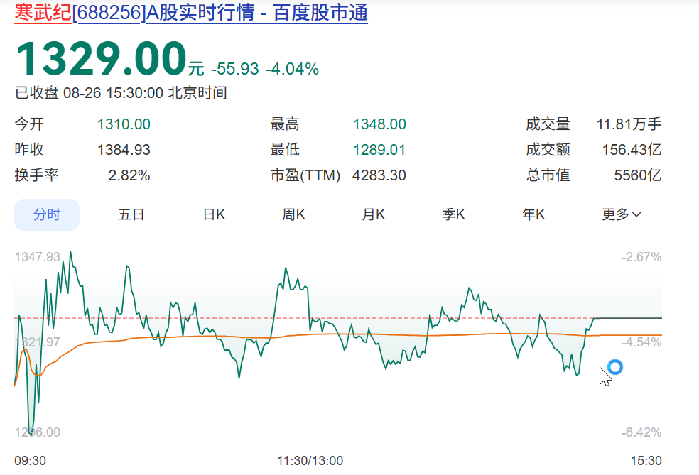 截至當日收盤,寒武紀股價報1329元/股,總市值5560億元。年內漲幅101.98%,成功翻倍。