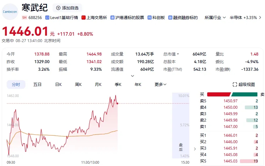 8月27日午后,寒武紀進一步走強,一度漲約10%,股價最高報1464.98元/股,一度超過貴州茅臺,總市值超6000億元。