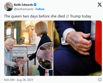 曾是反特朗普共和黨人創立的超級政治行動委員會“林肯計劃”(The Lincoln Project)工作人員,現為Youtuber的愛德華茲(Keith Edwards)貼出特朗普周一(25日)的手部照片與伊麗莎白女王二世過世前兩天的照片相比較。當天女王接見時任英國首相特拉斯(Liz Truss)。有人因此猜測特朗普可能病重。由于特朗普時而試圖用化妝遮掩瘀青痕跡,更加引起外界對其健康狀況的疑慮。