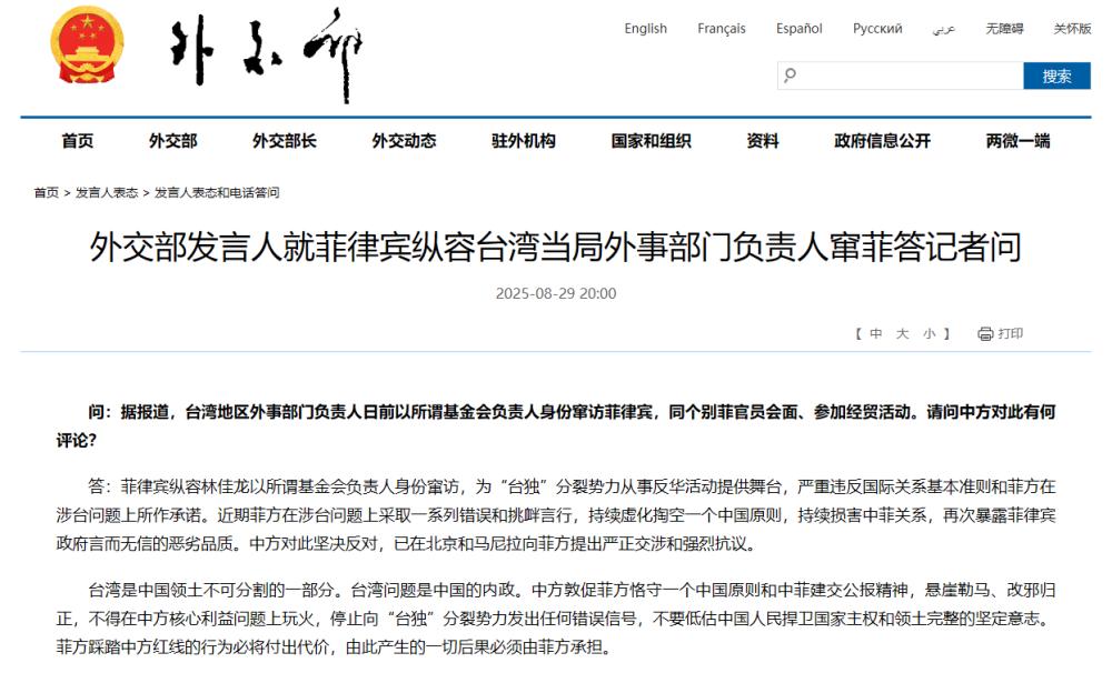 8月29日消息,外交部發言人就菲律賓縱容臺灣當局外事部門負責人竄菲答記者問。