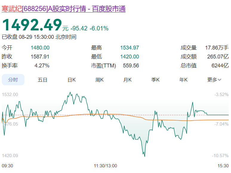 截至29日收盤,寒武紀報收1492.49元/股,較前一日收盤價1587.91元/股,每股跌95.42元。