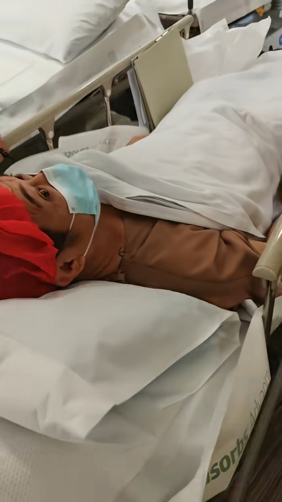▲李連杰躺在病床雙眼緊閉,露出痛苦神情。