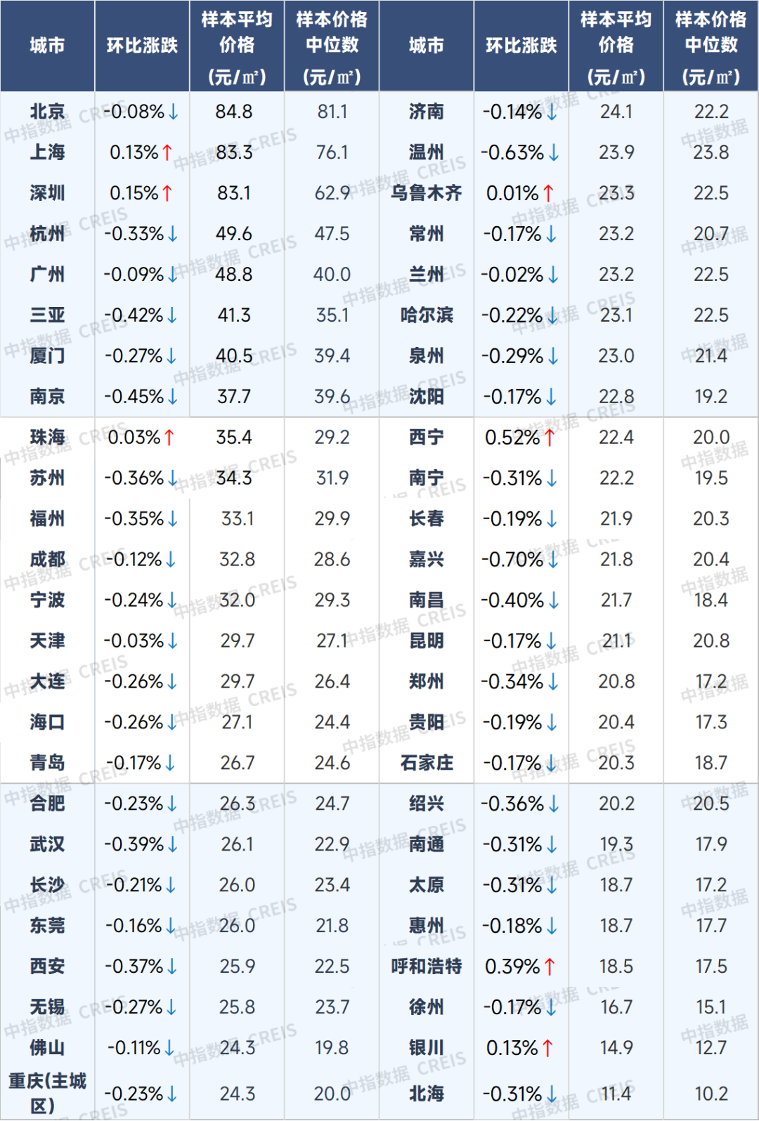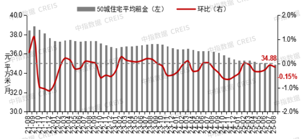 二手房方面,“以價換量”現象延續,8月百城二手住宅均價為13481元/平方米,環比下跌0.76%,同比下跌7.34%。租賃住宅方面,畢業季效應逐漸消退,住房租賃需求釋放節奏放緩,重點50城住宅平均租金環比跌幅略有擴大,8月50個城市住宅平均租金為34.88元/平方米/月,環比下跌0.15%,同比下跌3.76%。