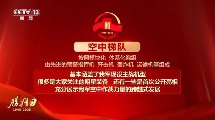 空中梯隊,按照模塊化、體系化編組,由先進的預警指揮機、殲擊機、轟炸機、運輸機等組成,基本涵蓋了我軍現役主戰機型,很多是大家關注的明星裝備,還有一些是首次公開亮相,充分展示我軍空中作戰力量的跨越式發展。