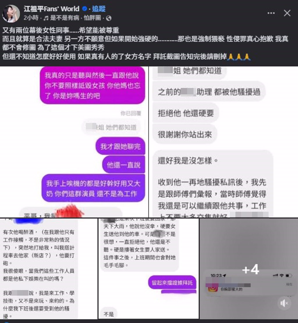 八點檔女星江祖平日前拋下震撼彈,公開女性友人私訊控訴遭“電視臺關系人士”性侵并偷拍的經歷,還PO出好幾張疑似性侵男的個資與正面清晰照,引發軒然大波,今(4日)凌晨時,江祖平于臉書公開好幾張對話截圖,內容都是電視臺女性工作人員控訴遭同一名男子性騷的過程,其中包括該男傳給女方的惡心言語。