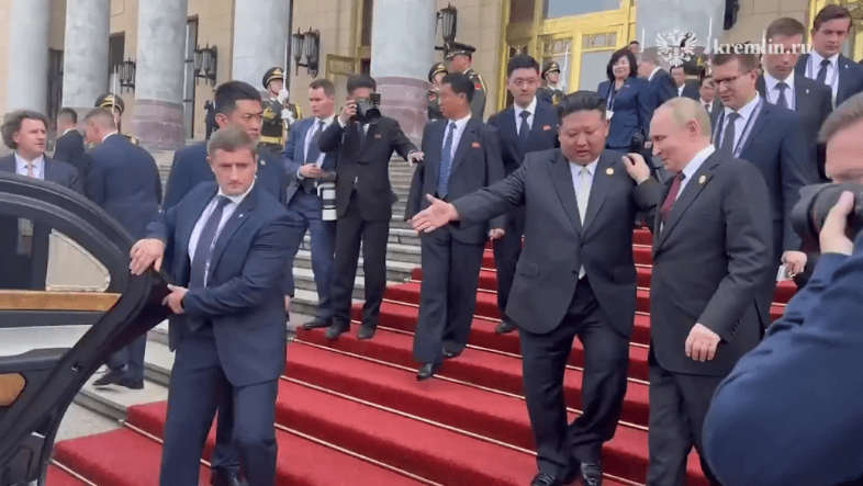 克里姆林宮昨日在通訊軟件Telegram上發布一段影片,顯示兩位領導人登上普京的座駕,并稱他們正前往會談途中。