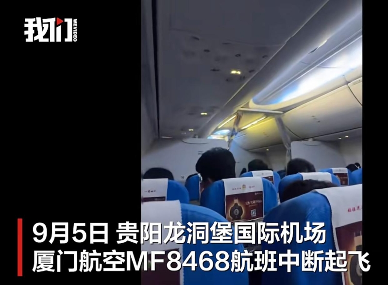 9月5日,貴陽龍洞堡國際機場,廈門航空MF8468航班中斷起飛,執行該航班的飛機在跑道上滑行,突然急剎后客艙傳出旅客尖叫聲,機場采取應急措施,旅客下機后被妥善安置。