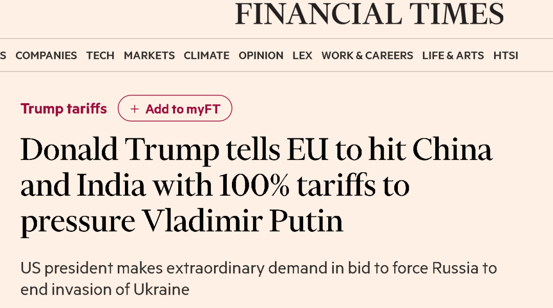 據英國《金融時報》和路透社披露,當地時間周二,在美國與歐盟的高級官員在華盛頓舉行的一場意在通過極限施壓俄羅斯結束俄烏沖突的會議上,美國總統特朗普提出了一個超乎尋常的要求:他想讓歐盟對購買俄羅斯能源的印度和中國這兩個大國都加征100%的關稅,以施壓俄羅斯盡快結束俄烏沖突。