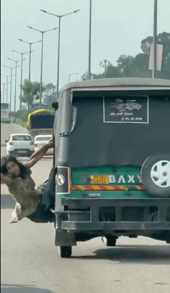事發于9日,地點為旁遮普邦賈朗達爾市(Jalandhar)44號國道。 根據社交媒體流傳的影片可見,一輛電動三輪車正在公路疾駛之際,一名女子突然從車內奮力爬出,雙手緊抓車身邊緣,雙腳懸空,并不斷高聲呼救,試圖引起周遭車輛注意。