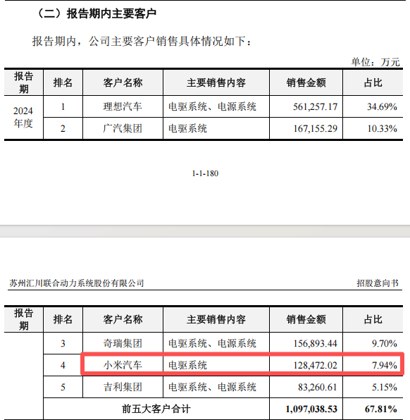目前,聯合動力的主要客戶包括理想汽車、廣汽集團、奇瑞汽車、小米汽車、吉利集團等,其中小米汽車是其2024年的第四大客戶,銷售收入為12.85億元,占總體銷售收入的比例為7.94%。