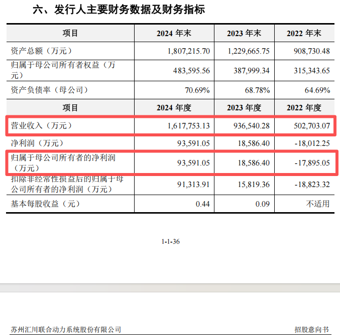 2022年至2024年,聯合動力的營業收入分別為50.27億元、93.65億元、161.78億元,歸母凈利潤分別為-1.79億元、1.86億元、9.36億元。