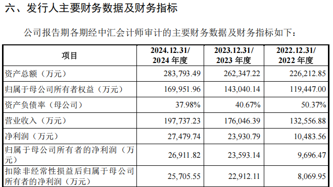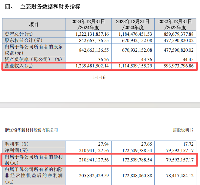 2022年至2024年,錦華新材的營業收入分別為9.94億元、11.15億元、12.39億元,歸母凈利潤分別為7959.22萬元、1.73億元、2.11億元。