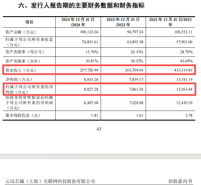 2022年至2024年,云漢芯城的營業收入分別為43.33億元、26.37億元、25.77億元,歸母凈利潤分別為1.36億元、7861.26萬元、8827.28萬元。