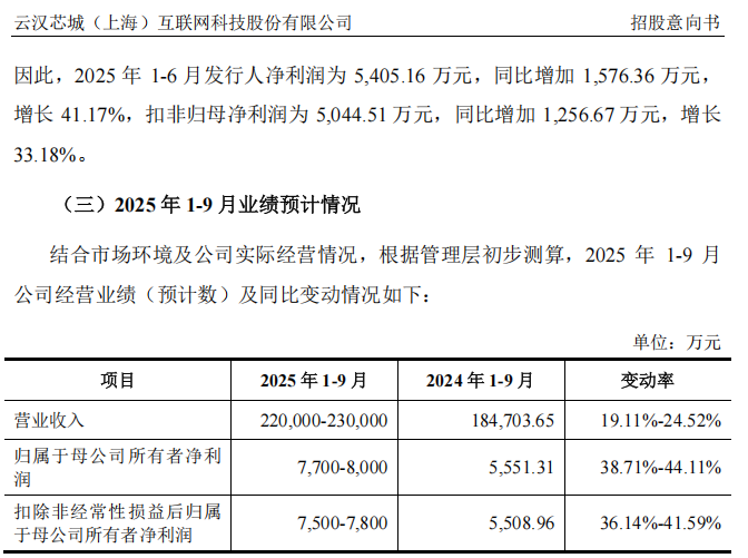 云漢芯城預計,2025年前三季度,公司的營業收入為22億元至23億元,同比增長19.11%至24.52%;歸母凈利潤為7700萬元至8000萬元,同比增長38.71%至44.11%。