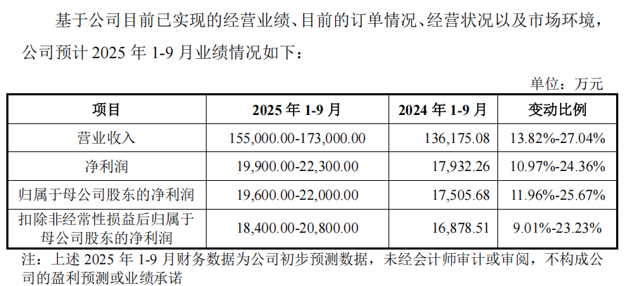 瑞立科密預計,2025年前三季度,公司的營業收入為15.50億元至17.30億元,同比增長13.82%至27.04%;歸母凈利潤為1.96億元至2.20億元,同比增長11.96%至25.67%。