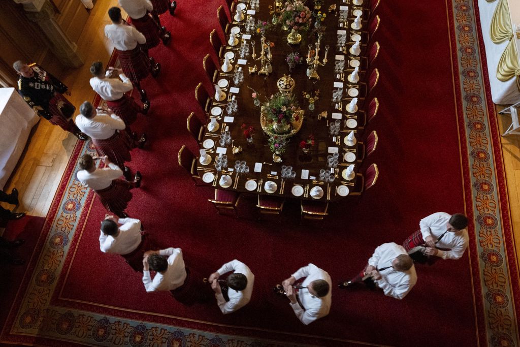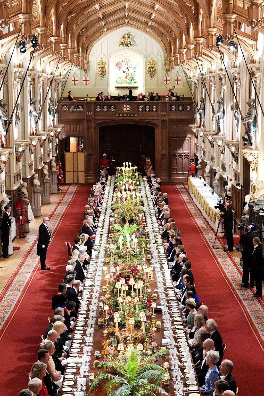 宴會場圣喬治廳是溫莎堡內最大廳堂,長 55.5 米、寬9米,全長40多米的餐桌,幾乎貫穿全場。餐桌由桃花心木制成。所有珍藏的瓷器、玻璃器皿及其他配件都從保險庫取出。桌布與餐巾折成荷蘭頭巾形狀,搭配精緻調味罐、花卉裝飾、珍貴瓷盤、燭臺及5種杯具,精心擺放。每個座位必須保持 18 吋(45.7公分)間距,工作人員甚至使用測量棒與特制鞋子以確保精準。19個餐務站分布在大廳四周,每站由4人服務,以紅綠燈系統協調上菜節奏。詳細的服務圖與特別說明標注王室與賓客的飲食需求。