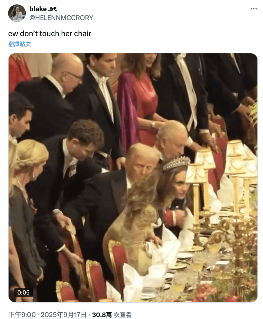 據報道,國宴當晚特朗普坐在英王查爾斯三世與凱特中間,當凱特坐下時,身后一名男侍從正準備幫她拉椅子,但特朗普卻搶著彎腰為竌特拉椅,一些社群媒體用戶認為,特朗普是在“獻殷勤”。有關畫面在X上瘋傳,發文者寫道:“咦!別碰她的椅子?!庇嘘P貼文觀看次數達21.7萬次,點贊685次。