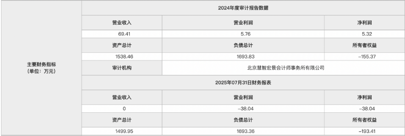 2024年、2025年前7月,標的企業營收分別為69.41萬元、0元,凈利潤分別為5.32萬元、-38.04萬元。截至2025年7月末,標的企業資產總計1499.95萬元,負債總計1693.36萬元。