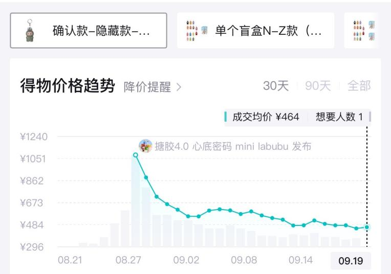 ▲8月28日推出的新品“迷你版Labubu”中隱藏款在得物平臺價格趨勢變化