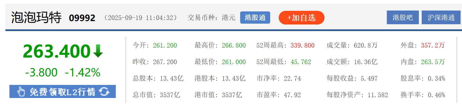 截至9月19日11時,泡泡瑪特報263.4港元/股,下跌1.42%。