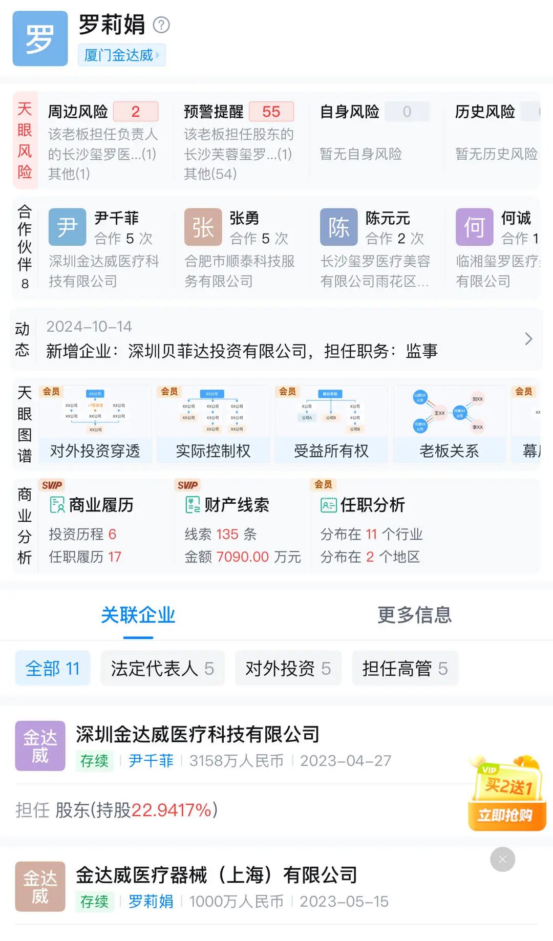 天眼查顯示,長沙璽羅醫療美容有限公司法定代表人陳元元,大股東為羅莉娟,持股90%,企業注冊資本200萬元。