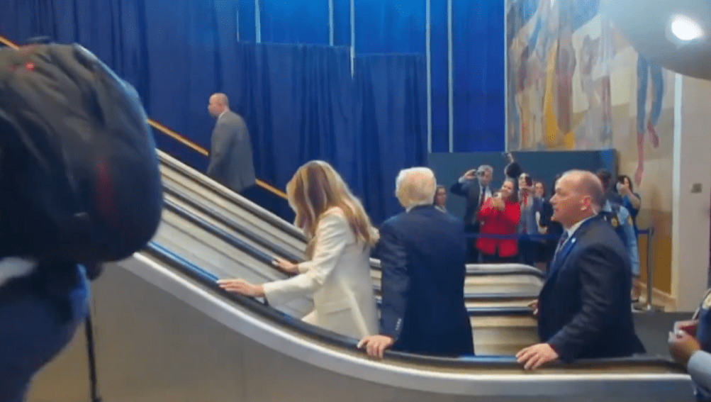 ▲特朗普與第一夫人梅拉尼婭抵達紐約聯合國總部正門后,讓記者拍完照,便登上自動扶梯,豈料扶梯竟然立即停止,令特朗普和梅拉尼婭露出尷尬神色。X@Trump_Fact_News