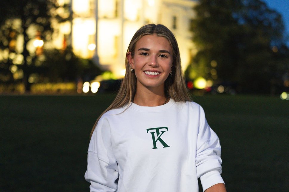 特朗普18歲孫女凱伊X推出自家服飾品牌,在白宮親拍宣傳照,展現甜美笑容。