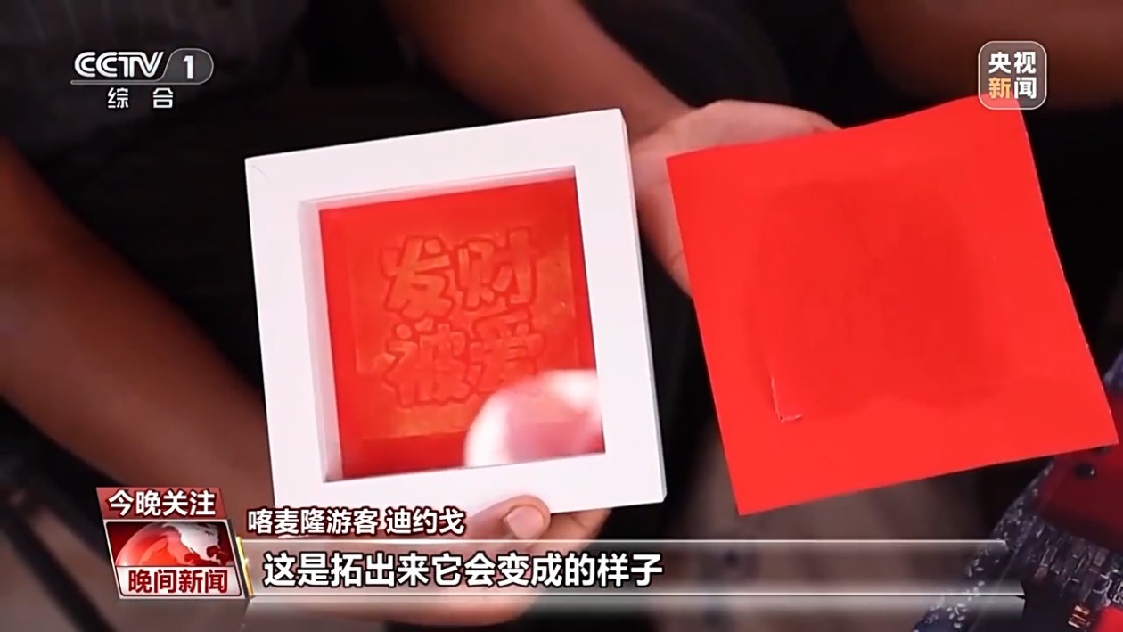 喀麥隆游客 迪約戈:這個是我正在做的,拓印發財被愛四個字,這是拓出來以后的樣子,我一直對中國的文化很感興趣,通過這個我可以學到更多中國的文化。