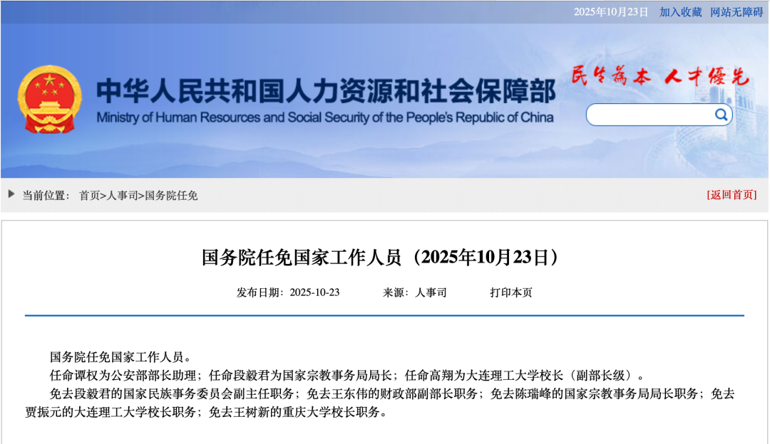 10月23日,人力資源社會保障部網站發布消息,國務院任免國家工作人員。