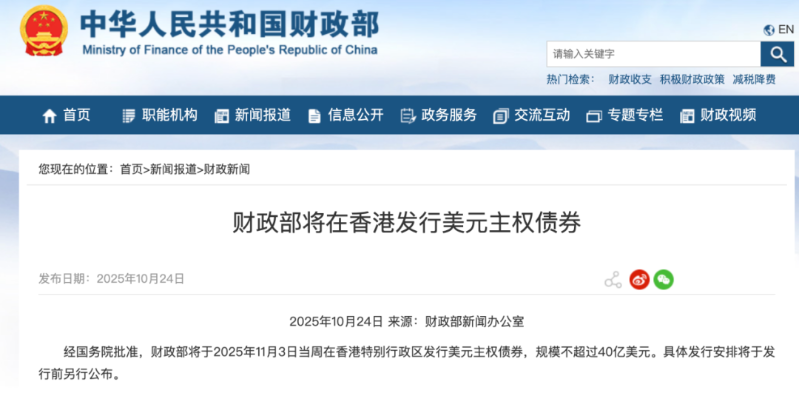 10月24日,經國務院批準,財政部將于2025年11月3日當周在香港特別行政區發行美元主權債券,規模不超過40億美元。具體發行安排將于發行前另行公布。
