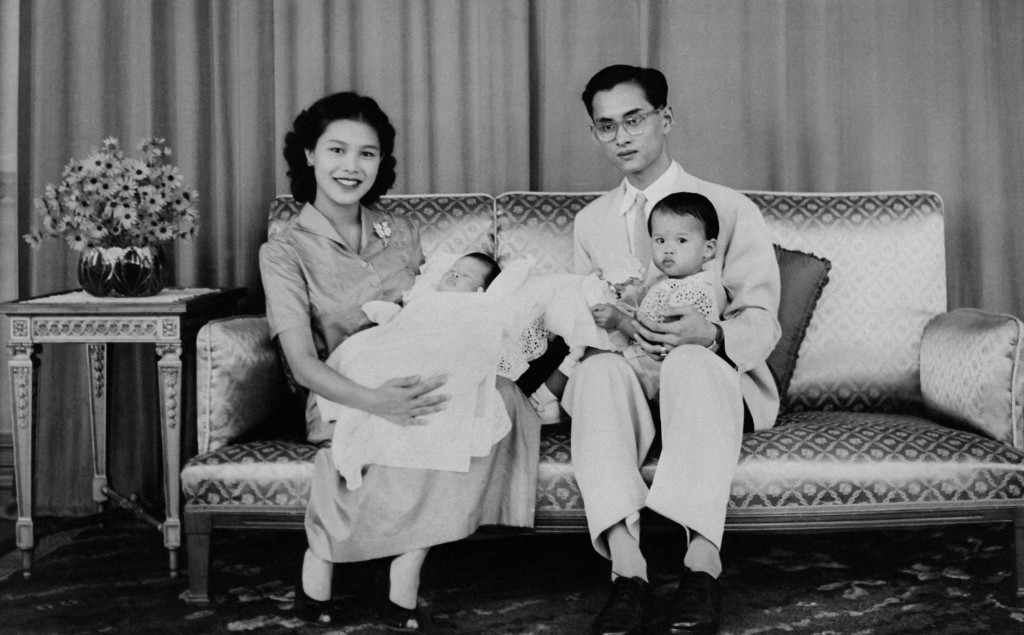 ▲詩麗吉與普密蓬手抱長子哇集拉隆功(右)及次女詩琳通(左)合照。法新社