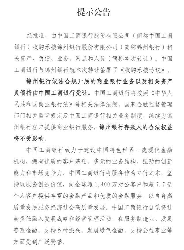 雙方已白紙黑字簽署《收購承接協議》。這意味著從今往后,所有錦州銀行的儲戶,將自動升級為“宇宙行”客戶。存款、理財、貸款等都將由工商銀行全權負責。