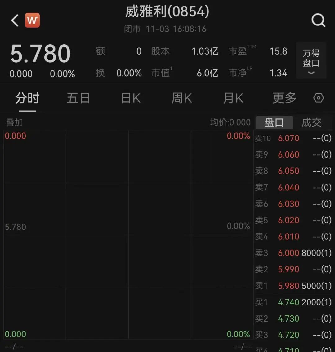 二級市場上,截至11月3日收盤,威雅利股價報5.78港元,最新市值為5.95億港元。