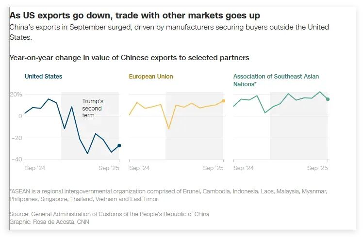 CNN稱,雖然中國對美國的出口額隨著特朗普第二個任期的到來同比出現下降,但中國與其他市場的貿易同期都在增加,這也令中國在對美出口總額同比下降的情況下,今年截至9月的出口總額仍實現了6.1%的增長。
