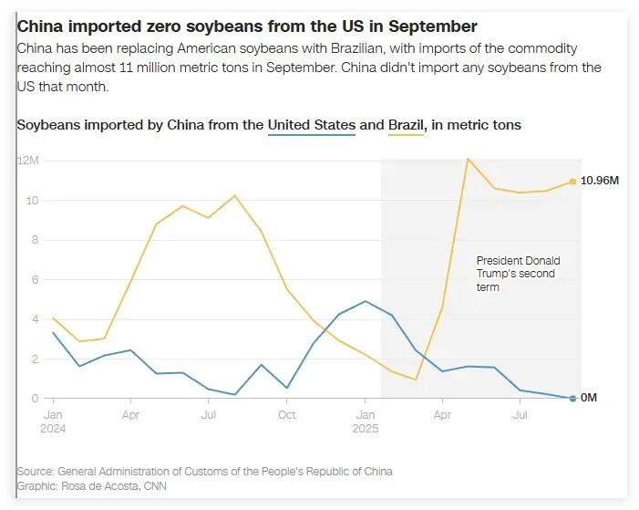 其中,美國有線電視新聞網(CNN)就在一篇11月2日的文章中,引用中國海關總署的官方數據制作了4張簡單的圖表,并以此直觀地呈現出了兩個大國在博弈時,發生了哪些變化。