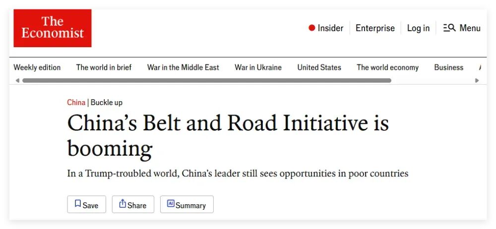 最后值得一提的是,除了CNN這篇報道中呈現的數據圖表,英國《經濟學人》雜志還在本月的一篇報道中談到了中國 “蓬勃發展”的“一帶一路”在這一輪中美博弈中發揮的積極作用,稱共建“一帶一路”倡議促進了中國的貿易多元化。